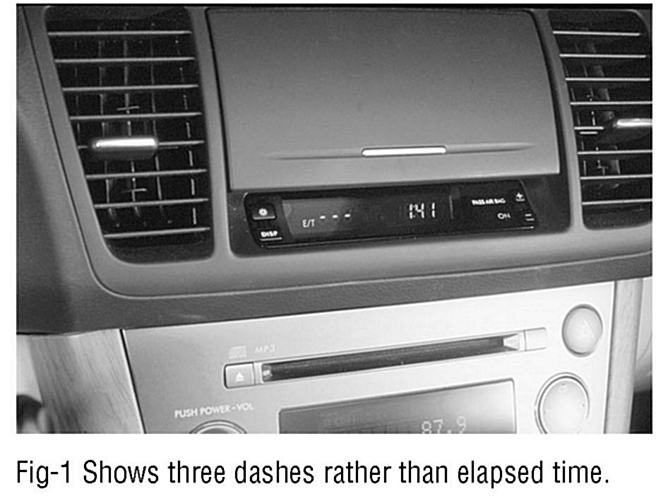 The Information Display on Legacy / Outback indicates as "E/T 0:00" upon engine start up when E/T is selected, then accumulates journey time accordingly. However, there are some cases that the Information Display fails to indicate the correct Elapsed Time and rather indicates as - : - In this case, the vehicle does not accumulate the journey time. This symptom is caused by a failure of the Information Display to recognize Engine start up as IG Key position moved from IG-ON to START (i.e., ACC-OFF). The change is in the Information Display logic to enable recognition of engine start up to begin accumulating the journey time regardless of IG Key position.