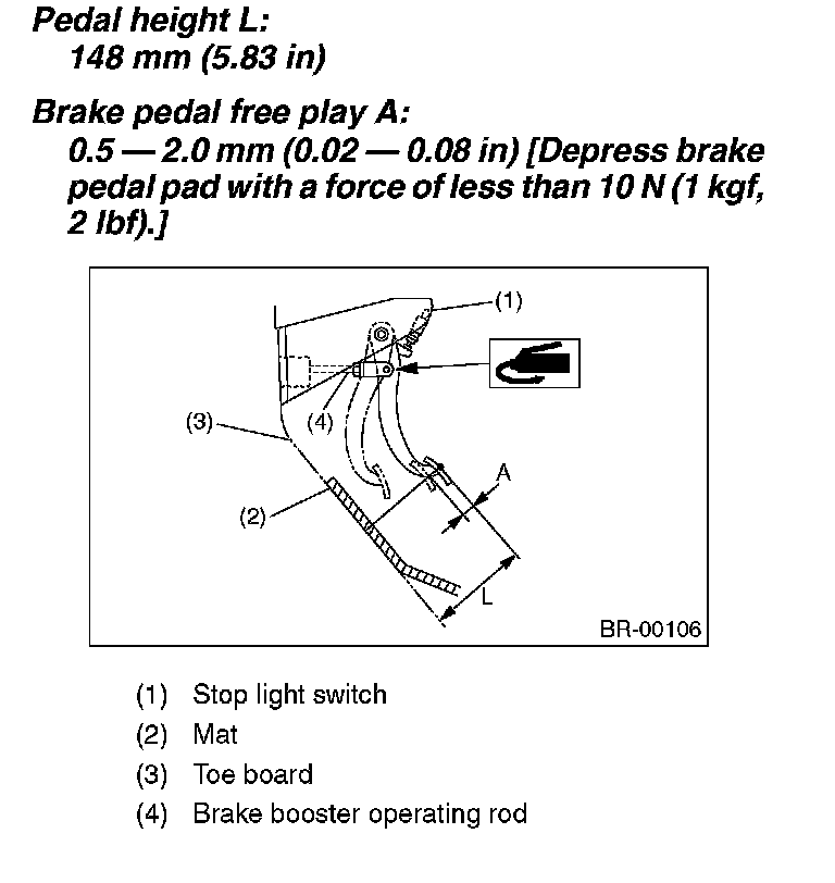 Brake pedal free play 0.5 - 2.0 mm (0. 02 - 0.08 inch) [Depress brake pedal pad with a force of less than 10 Nm (1 kgf, 2 ft. lbs.).]