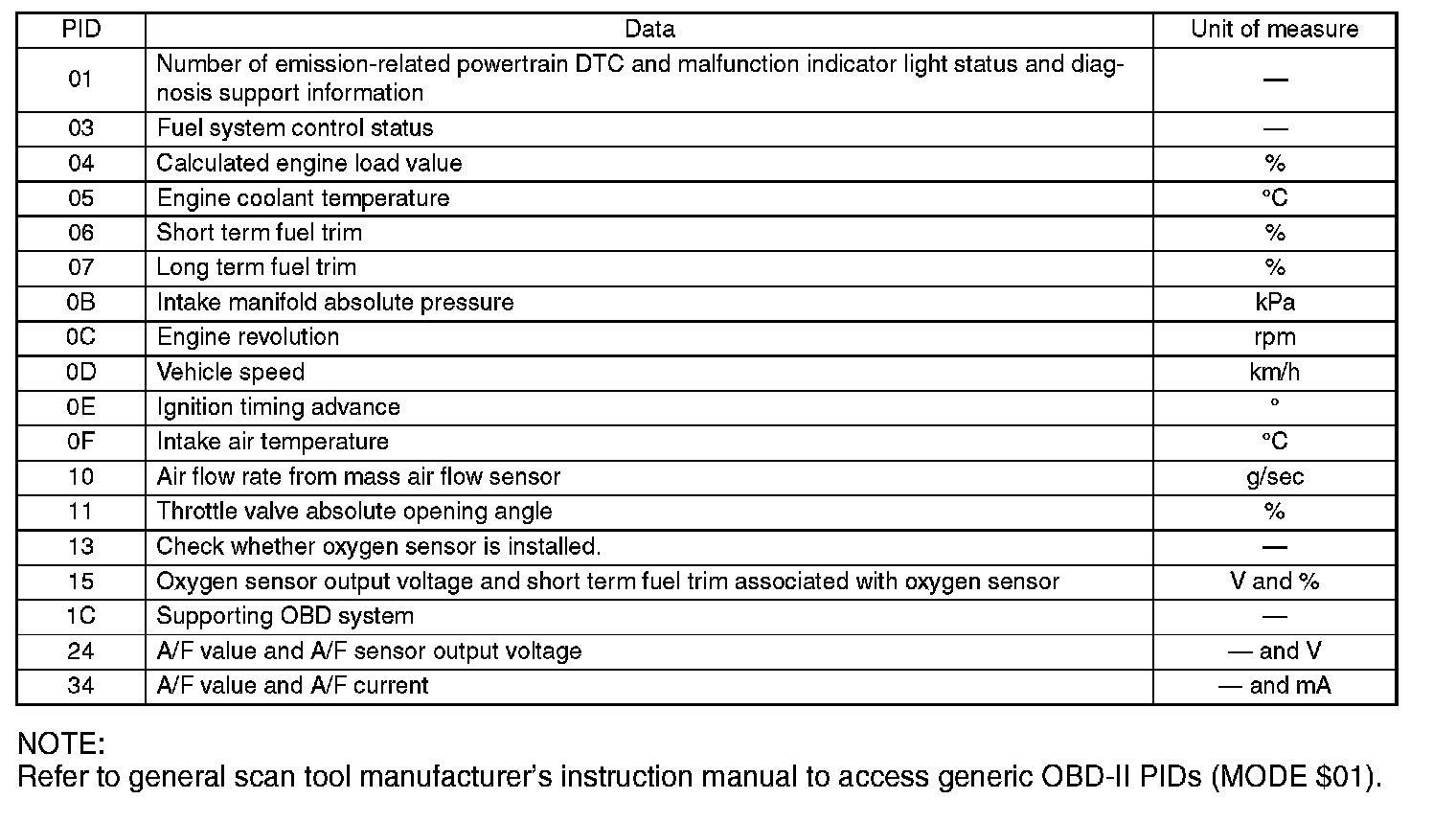 A list of the support data and PID (Parameter Identification) codes are shown in the table.