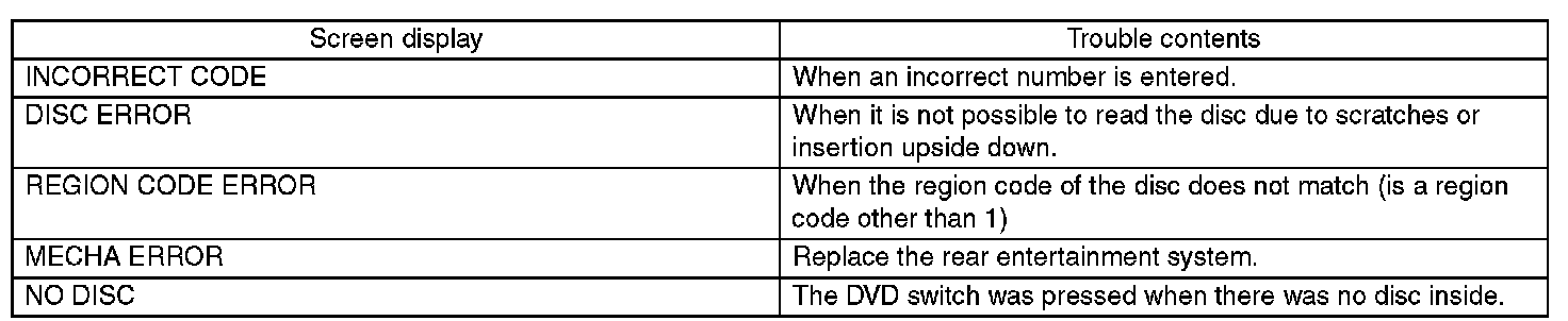 NG: If the images from the DVD is not displayed, check whether the DVD-ROM is set in the rear entertainment system, whether the correct side is set, type of the DVD-ROM, the existence of any scratches, etc.If there are no problems on the DVD-ROM, the main body is defective.