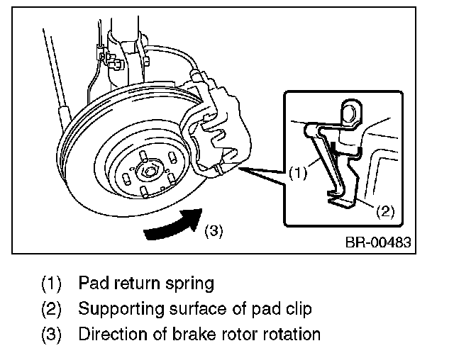 ^ Correctly install the pad return spring to the supporting surface of the pad clip as shown in the figure.