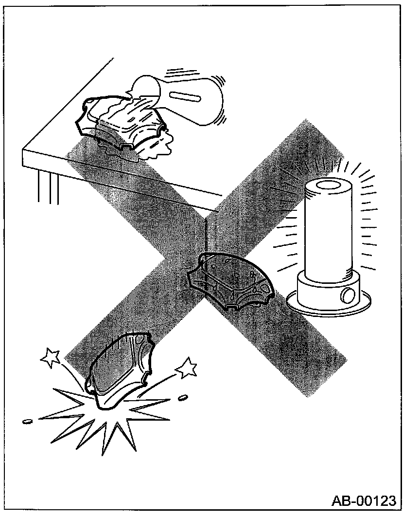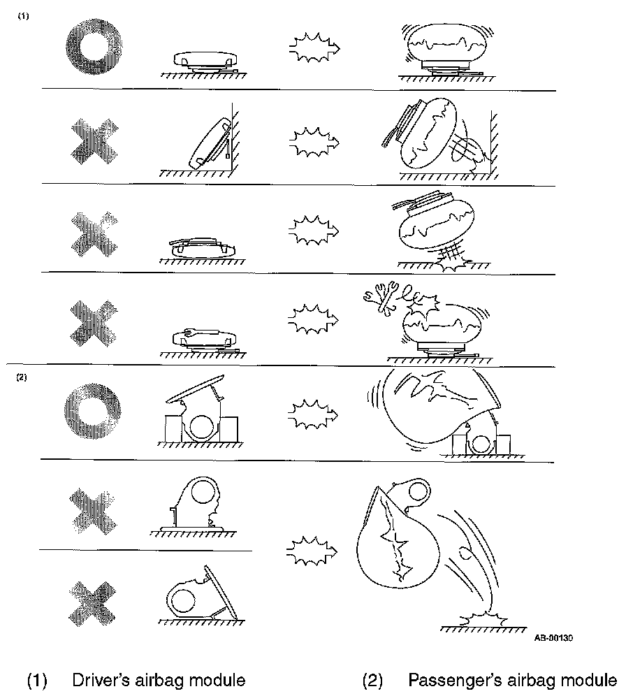 - When storing a removed airbag module, do not place any objects on it or pile them up. If the airbag inflates for some reason when it is placed with its pad side facing downward or under any object, a serious accident may result.