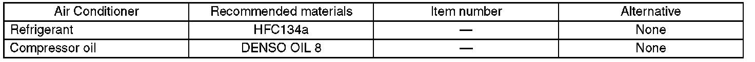 Standard air conditioners on Subaru vehicles use HFC134a refrigerant. Do not mix it with other refrigerants. Also, do not use any compressor oil other than DENSO OIL 8.