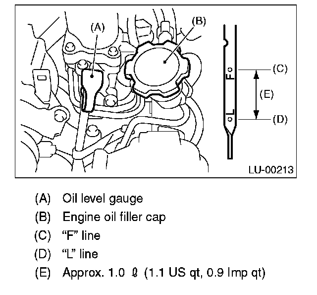 11) After the engine stops, recheck the oil level. If necessary, add engine oil up to the "F" line on level gauge.