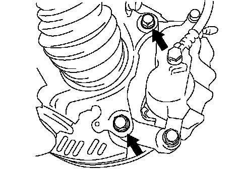4. Remove the caliper body and support from housing, and suspend it from strut using a wire.