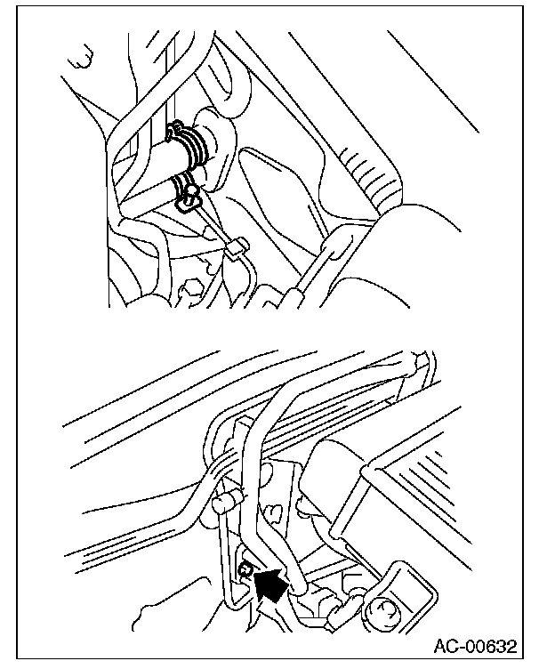 4. Remove the bolt securing expansion valve and pipe in engine compartment. Release the heater hose clamps in engine compartment to remove the hoses.