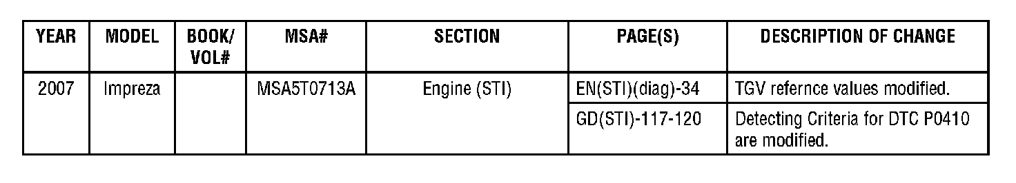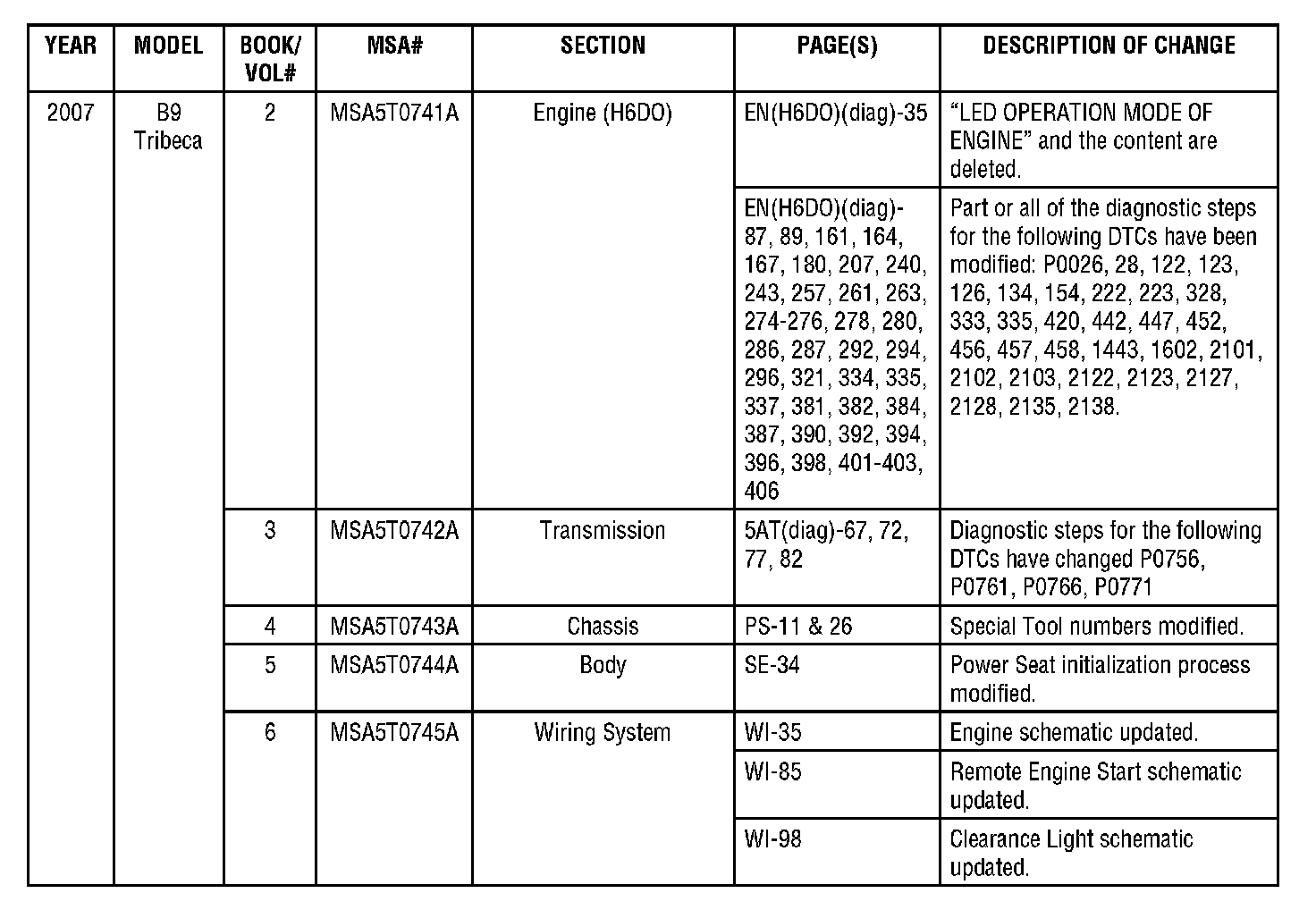 The purpose of this bulletin is to provide a description of current changes to Service Manuals available via the Subaru Technical Information System (STIS) web site. The tables contained within this bulletin are to be used as guides for becoming aware of the latest changes. We advise you to always refer to the STIS web site when looking for the latest Service information. Printed pages will not be made available to update printed Service Manuals.