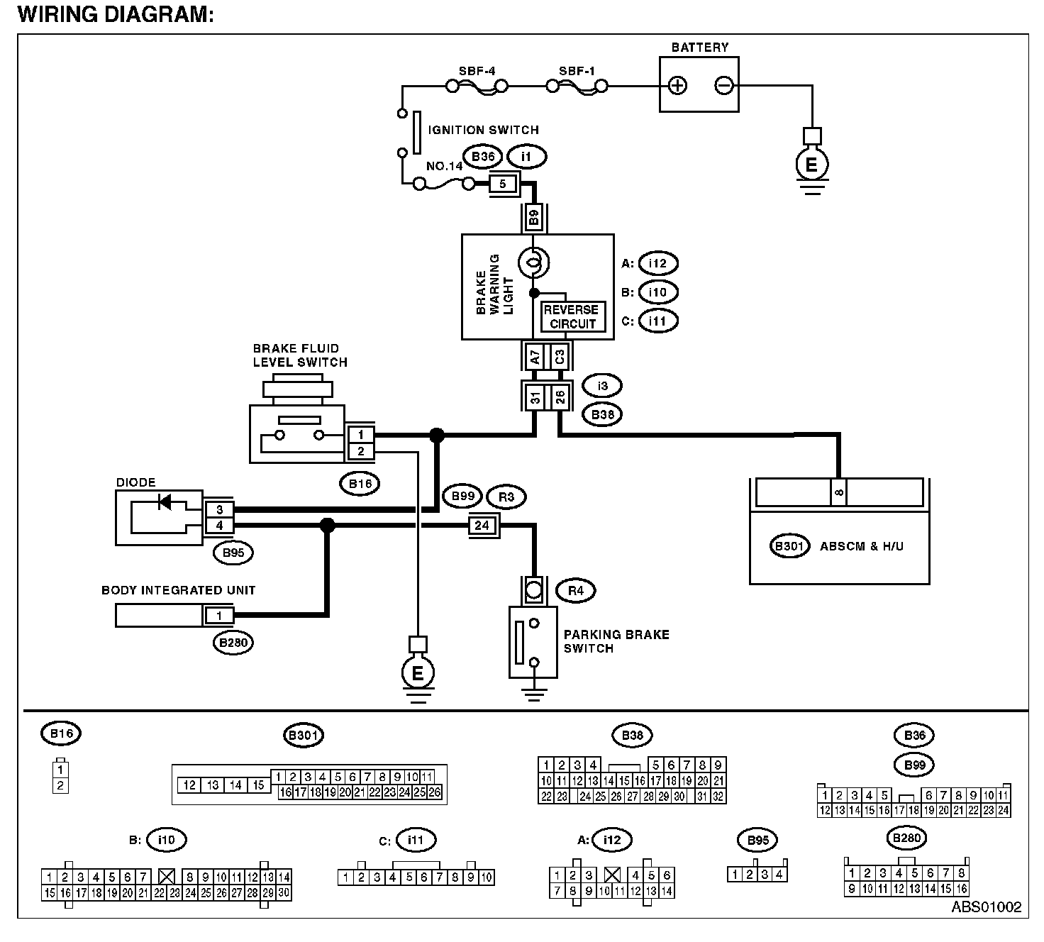 NOTE: If the ABS warning light is lit, perform the diagnosis of "ABS WARNING LIGHT DOES NOT GO OFF", then the diagnosis of "BRAKE WARNING LIGHT DOES NOT GO OFF" after repairing it.