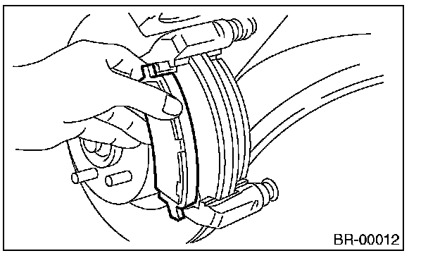 ^ A wear indicator is installed on inner pad. If the pad is worn to the limit, the end of wear indicator contacts disc rotor, and a squeaking sound is heard as the wheel rotates. If the sound is heard, replace the pad.
