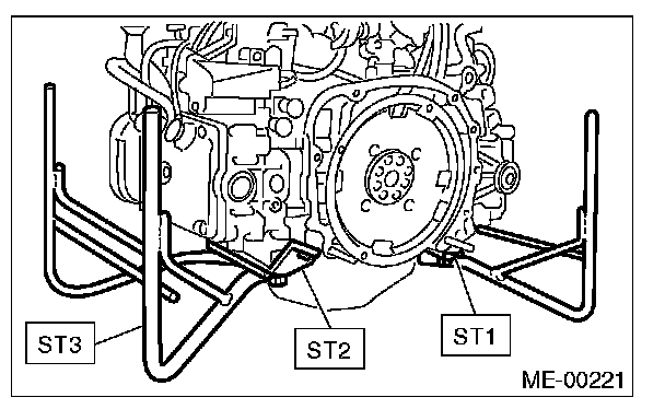 1) After removing the engine from body, secure it to ST in the following procedure.