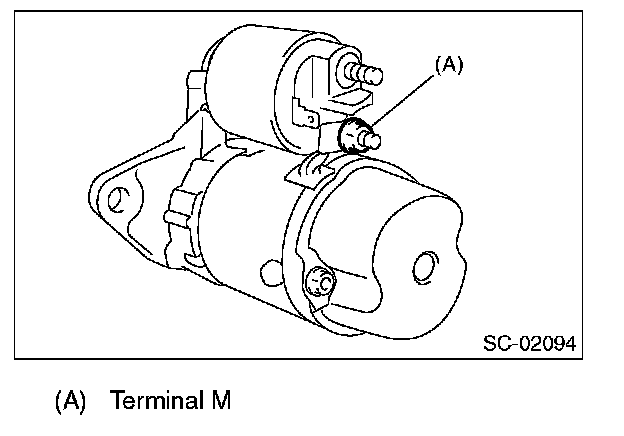 2. Disconnect the connector from terminal M. Then using a lead wire, connect the positive terminal of battery and terminal M and ground terminal to starter body.