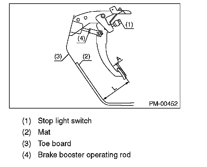 3) If it is not within the specification, loosen the lock nut of brake booster operating rod, and rotate the rod to adjust the pedal height L within the specification.