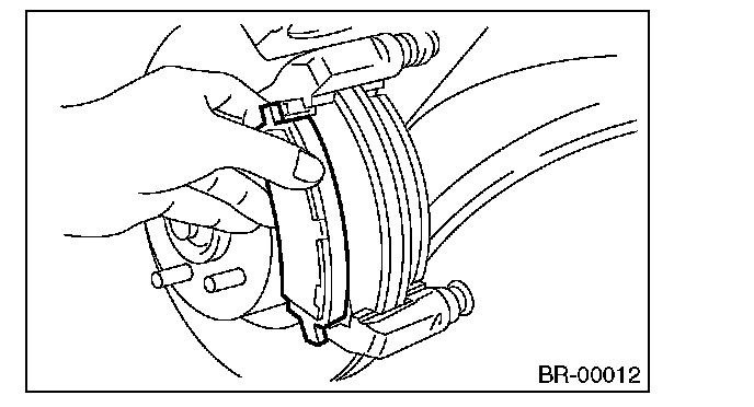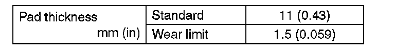 ^ A wear indicator is installed on the inner disc brake pad. If the pad is worn to the limit, the end of wear indicator contacts disc rotor, and a squeaking sound is heard as the wheel rotates. If the sound is heard, replace the pad.