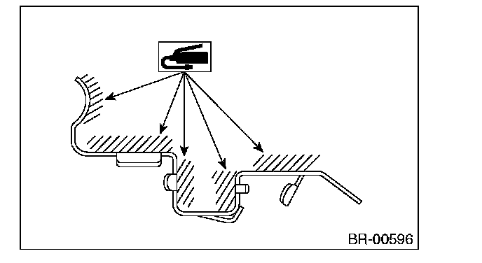 1) Apply a thin coat of Molykote M7439 (Part No. K0770YA000) or grease contained in the pad kit to the pad clip.