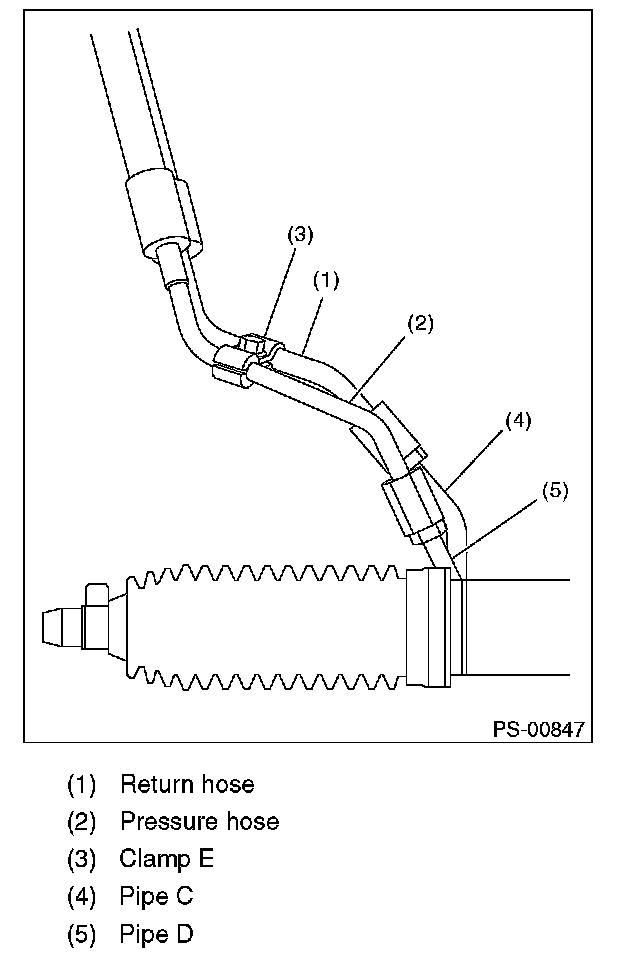 5) Temporarily connect pressure hose and pipe C, and the return hose and pipe D. Temporarily tighten the bolt of clamp E.