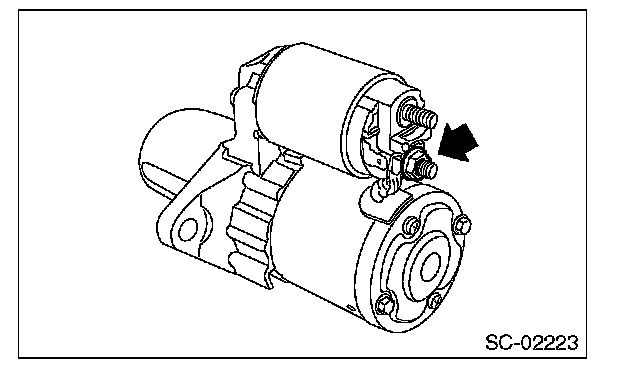 1. Loosen the nuts fastening the magnet switch assembly M terminal, then disconnect the harness from the terminal.