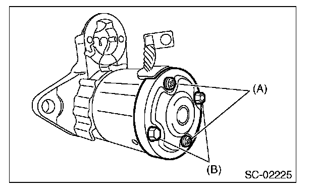 3. Remove screws (A) of the brush holder assembly, and through bolts (B) on both sides, and remove the starter cover assembly.