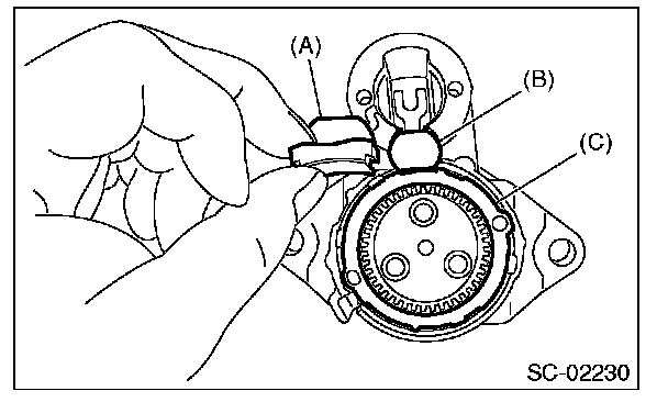 6. Attach rubber seal (A), plate (B), and rubber seal (C).