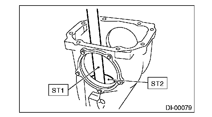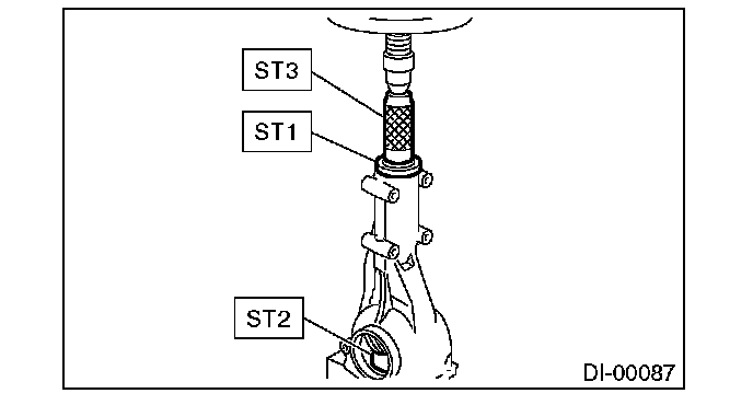 2) Install the front bearing race to the differential carrier using ST1 and ST2.