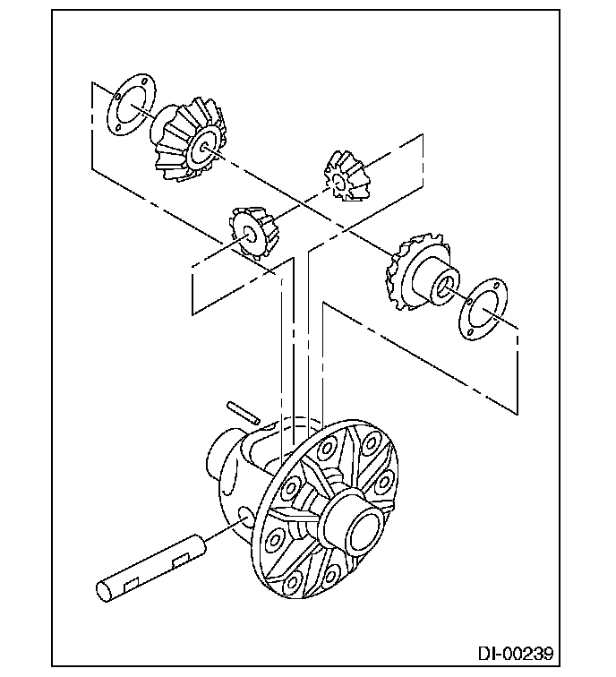 11) Assembling differential case Install the side gears and pinion mate gears, with their thrust washers and pinion mate shaft, into the differential case.