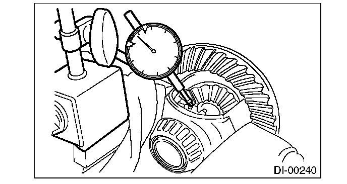 If the hypoid driven gear runout on its back surface exceeds the specification, check for any foreign objects between the hypoid driven gear and differential case, and for any deformation of the case or gear.