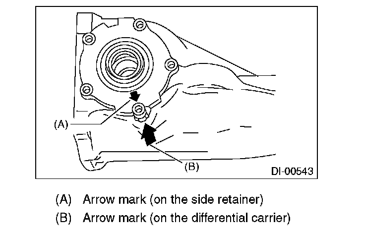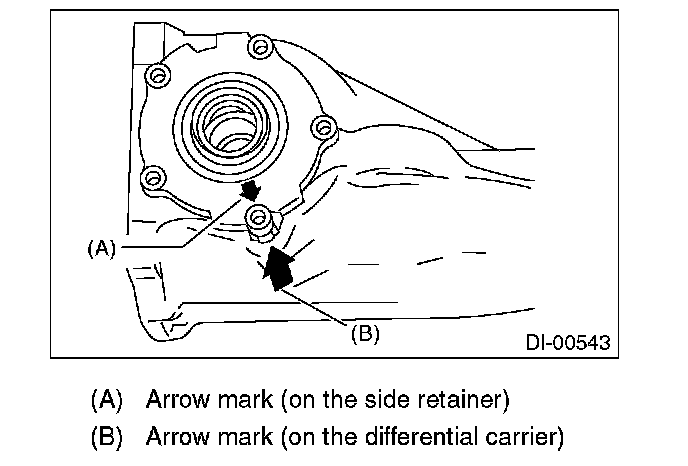 4) Align the arrow mark on differential carrier with the arrow mark on side retainer during installation.