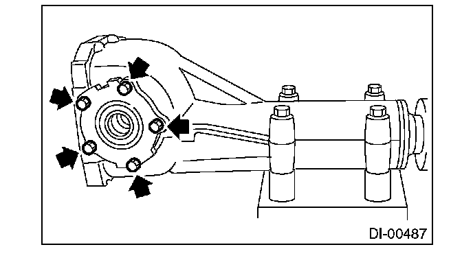 7) At the same time, measure the total preload of the drive pinion. Compared with the resistance when differential case is not installed, if the total preload is not within specification, adjust the thickness of side retainer shims, increasing/reducing both shims by an even amount at a time.