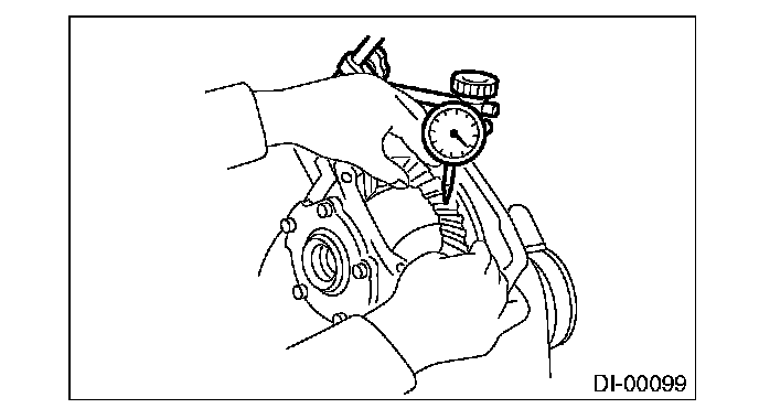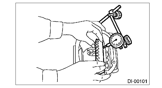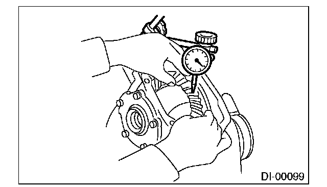 6) Measure the backlash between the hypoid driven gear and drive pinion. Set the magnet base on differential carrier. Align the contact point of dial gauge with the tooth surface of hypoid driven gear, and move the hypoid driven gear while securing the drive pinion. Read the value indicated on dial gauge. If the backlash is not within the range of specifications, adjust the side retainer shim using the following procedures.