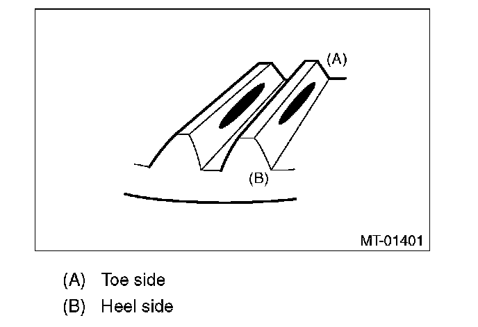 Check item: Tooth contact pattern is slightly shifted toward toe side under no-load rotation. (When driving, it moves towards the heel side.)