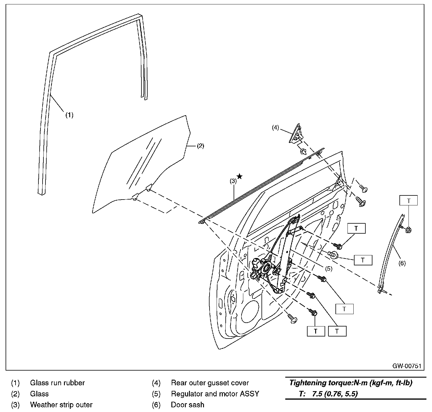 Tightening torque: Refer to "COMPONENT of General Description". Ref. to REAR DOOR GLASS, COMPONENT, General Description.>