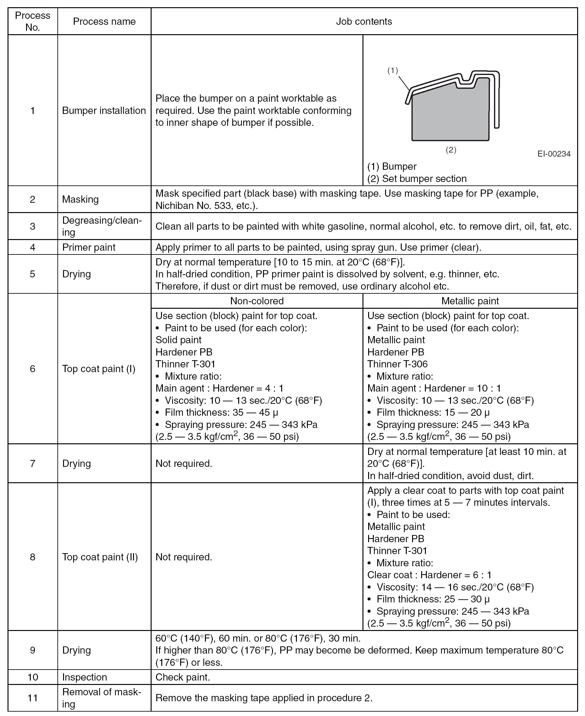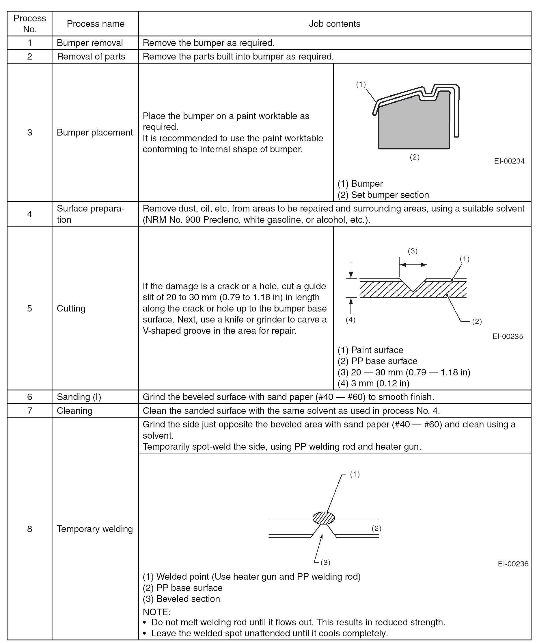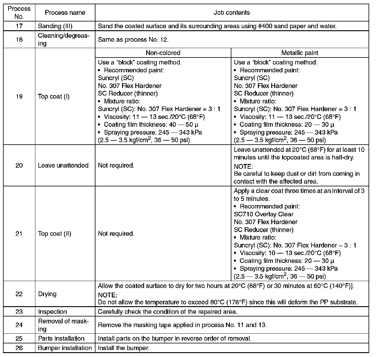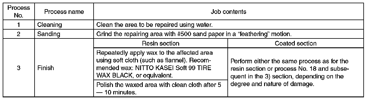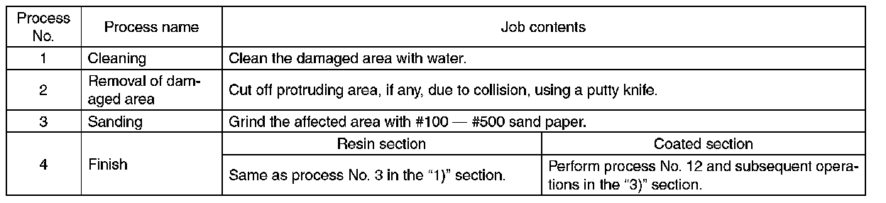 NOTE: All PP bumpers are provided with a grained surface, and if the surface is damaged, it cannot normally be restored to its former condition. Damages limited to the shallow scratches that cause only a change in the luster of the base material or coating, can be almost fully restored. Before repairing a damaged area, explain this point to the customer and obtain an understanding about the matter. Repair methods are outlined below, based on a classification of the extent of damage.