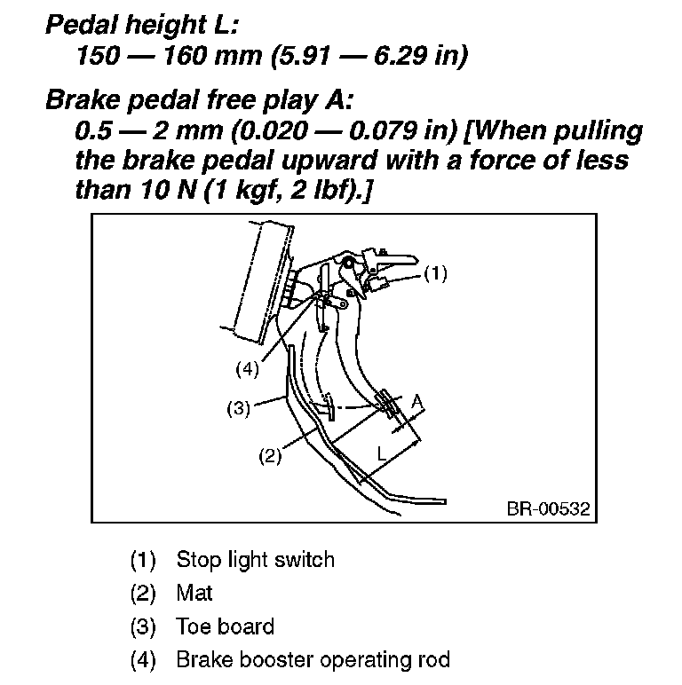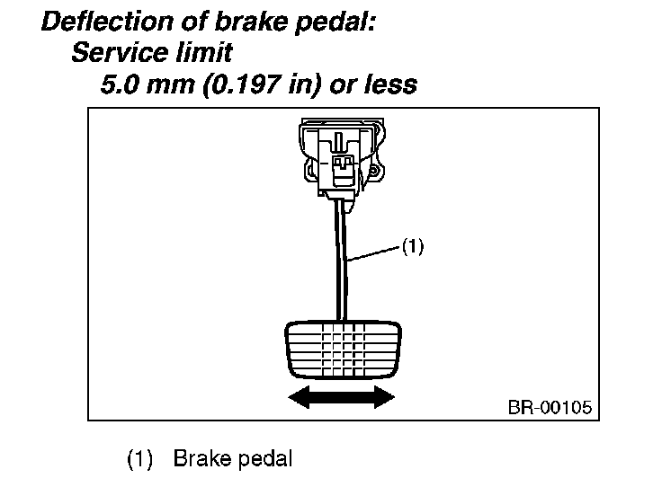 1) Move the brake pedal pads in a horizontal direction with a force of approx. 10 N (1 kgf, 2 lbf), and check that the pedal deflection is in the range of specifications.