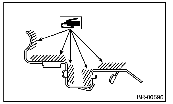 1) Apply a thin coat of Molykote M7439 (Part No. K0770YA000) or grease contained in the pad kit to the pad clip.