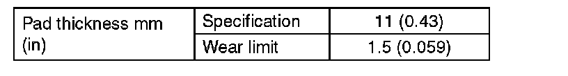 ^ A wear indicator is installed on the inner disc brake pad. If the pad is worn to the limit, the end of wear indicator contacts disc rotor, and a squeaking sound is heard as the wheel rotates. If the sound is heard, replace the pad.