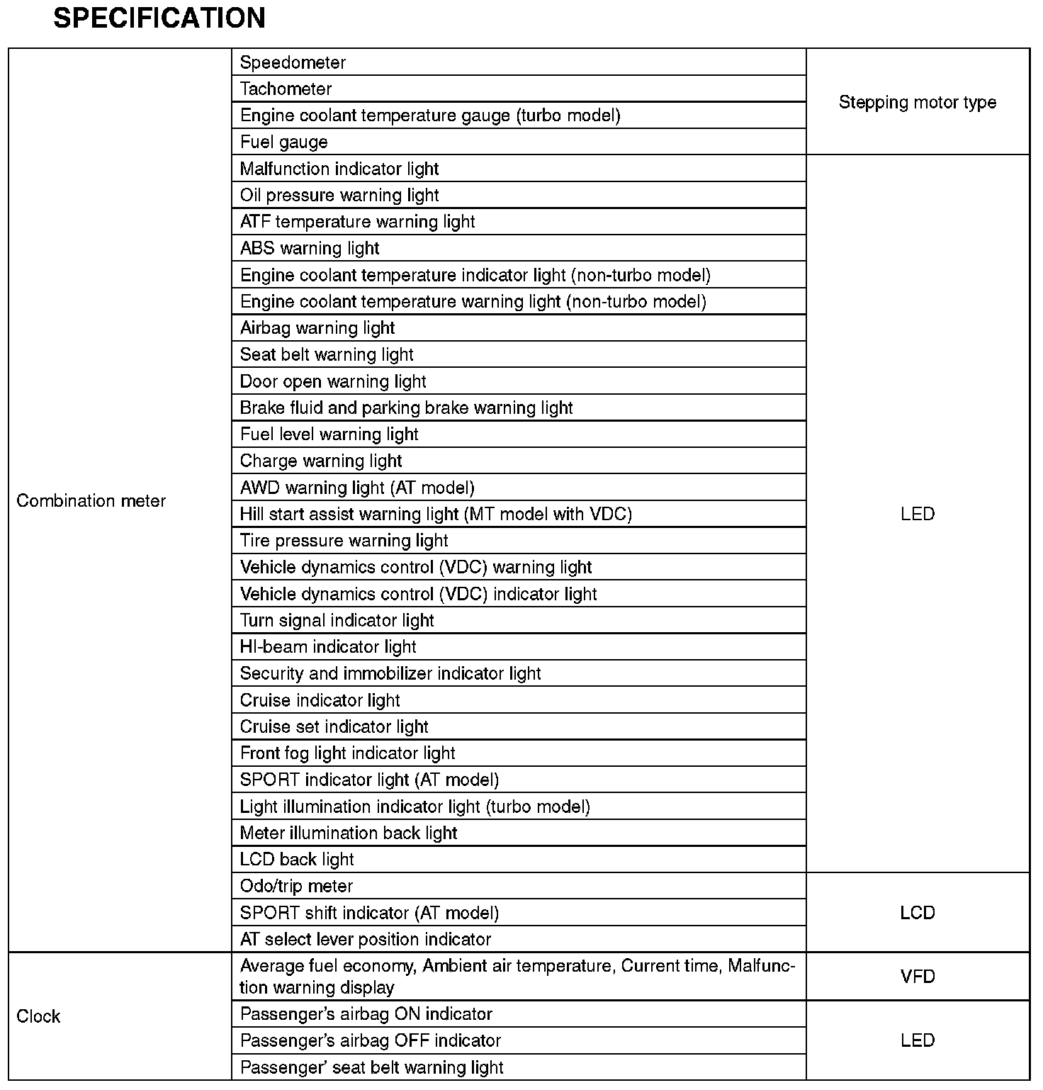 Instrument Panel, Gauges and Warning Indicators: Specifications