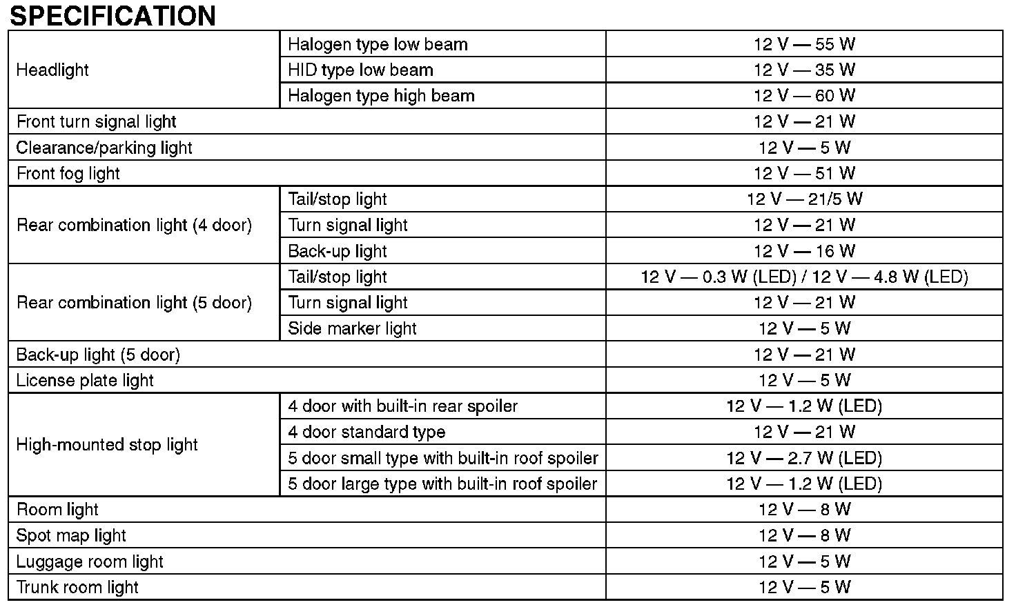 Lighting and Horns: Specifications