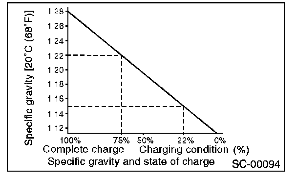 2. Measuring the specific gravity of the electrolyte in the battery will disclose the state of charge of the battery. The relation between specific gravity and state of charge is as shown in the figure.