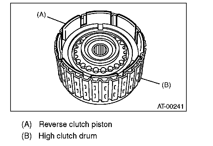 3) Install the reverse clutch piston to the high clutch drum. Align the groove on reverse clutch piston with the groove on high clutch drum during installation.