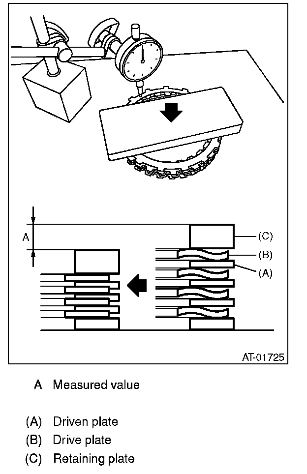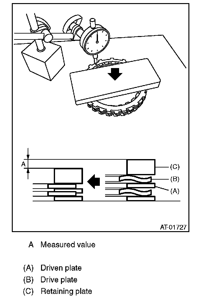 Calculate with A and B dimensions recorded before. If the calculated value exceeds the service limits, replace the drive plate and select and adjust the retaining plate to be within initial standard values.
