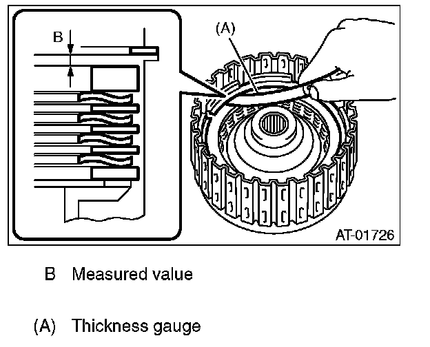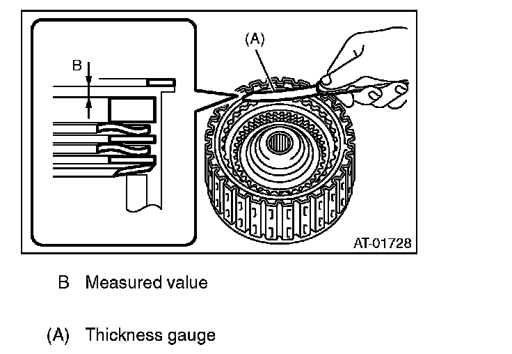 9) Measure and record the clearance "B" between the retaining plate and snap ring. (Reverse clutch) At this time, do not press down the retaining plate.