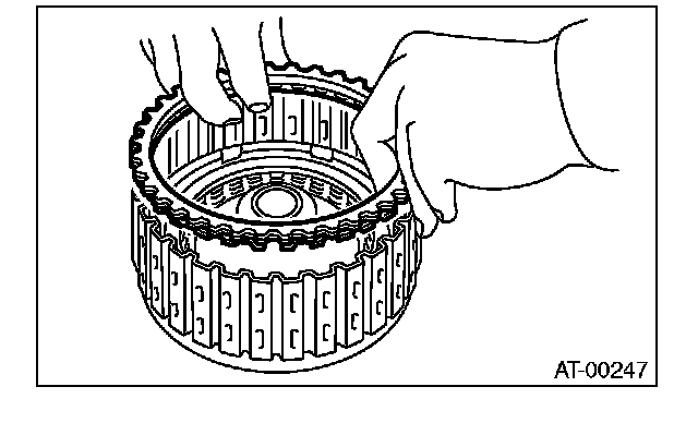 9) Install the thickest driven plate to piston side, and then install the driven plate, drive plate, retaining plate to high clutch drum.