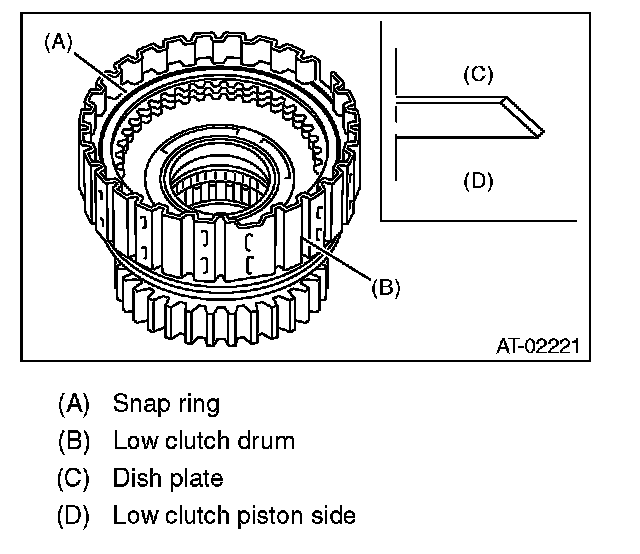 18) Install the snap ring to the low clutch drum.