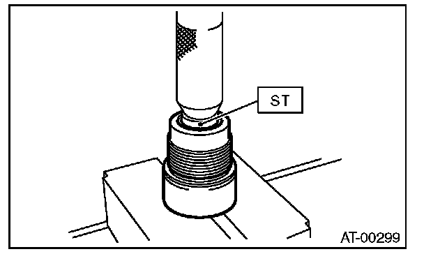 5) Using ST1, ST2 and ST3, set the cover on the piston and press against it, and attach the snap ring. At this time, be careful not to bend the cover seal.