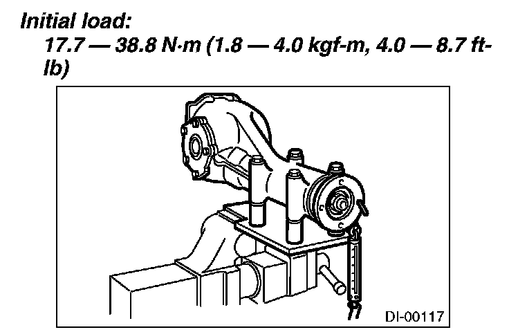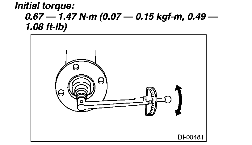 7) At the same time, measure the total preload of the drive pinion. Compared with the resistance when differential case is not installed, if the total preload is not within specification, adjust the thickness of side retainer shims, increasing/reducing both shims by an even amount at a time.