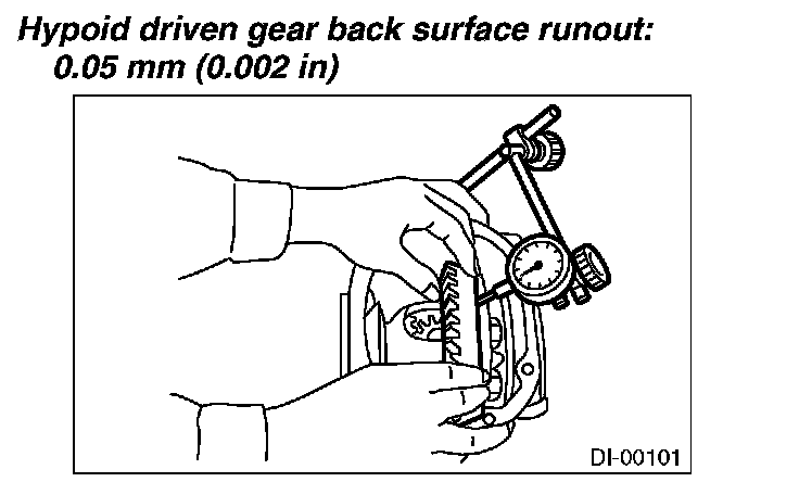If the runout on the back side of the hypoid driven gear exceeds the specification, check for any foreign material between the hypoid driven gear and differential case, and for any deformation of the case or gear.