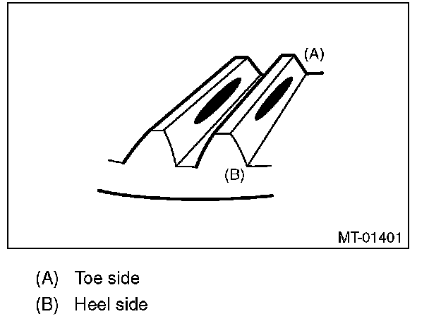 Check item: Tooth contact pattern is slightly shifted toward toe side under no-load rotation. (When driving, it moves towards the heel side.)