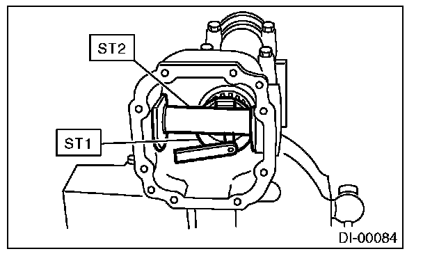 2) Install the front bearing race to the differential carrier using ST1 and ST2.