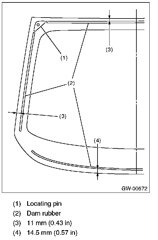 - Attach the seal between the ceramic print cutout portions (3) located at the lower edge of the glass (driver's seat side).