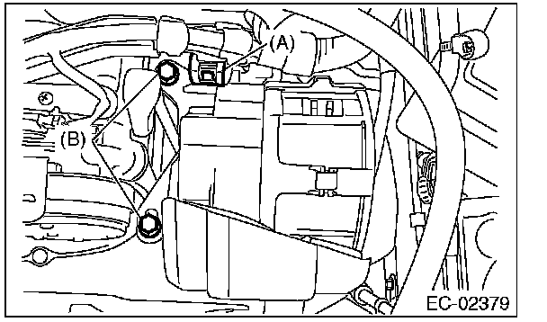 4. Disconnect the connector (A) and air duct (B) from secondary air pump and remove the secondary air pump.