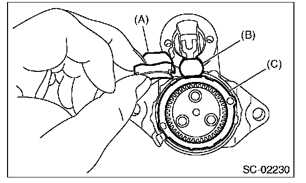 3. Remove screws (A) of the brush holder assembly, and through bolts (B) on both sides, and remove the starter cover assembly.